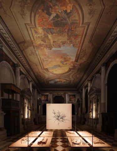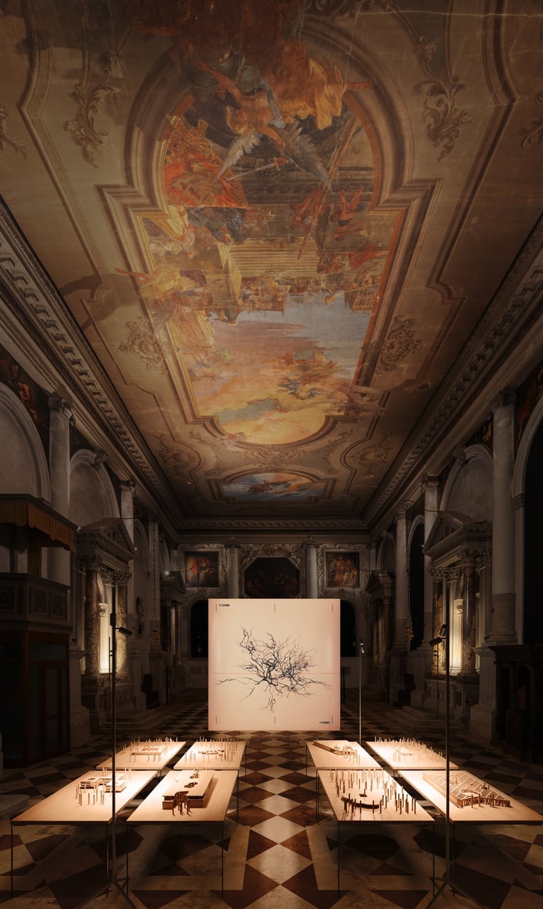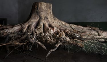 The exhibition begins with an installation of an uprooted tree stump, acting as an emotional trigger, embodying the reality of what is lost—both physically and symbolically—when the roots that sustain life are severed. It also presents architectural models of late 20th- and 21st-century projects inspired by the natural environment, particularly the trees of the area.